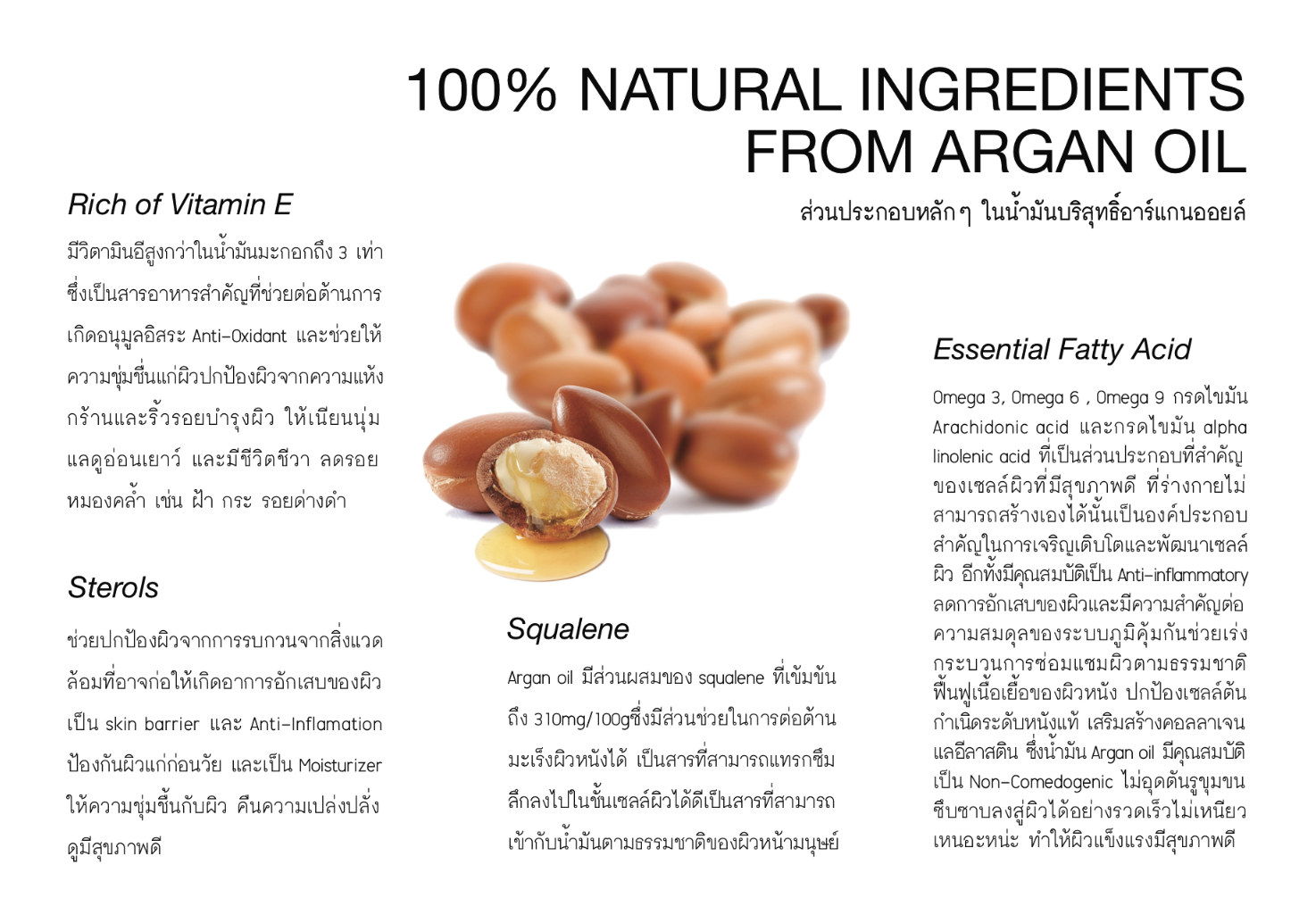 5. Squalene ARGAN OIL มีส่วนผสมของ Squalene ที่เข้มข้นถึง 310mg./100g. ซึ่งส่วน ช่วยในการต่อต้านมะเร็งผิวหน้งได้