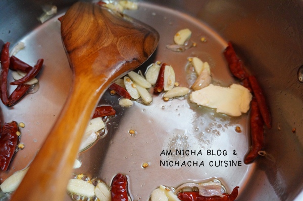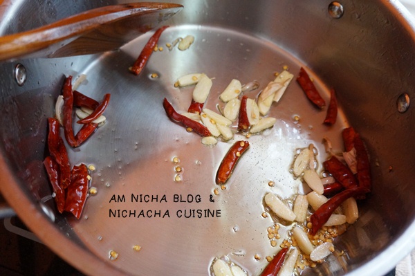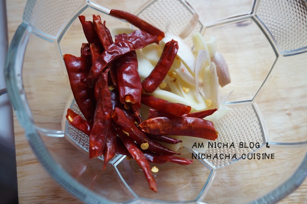 ต่อไปคือพริกแห้งและกระเทียมค่ะ นิชาใช้กระเทียมกลีบใหญ่หั่นบางๆ ส่วนพริกแห้งก็หักครึ่งค่ะ